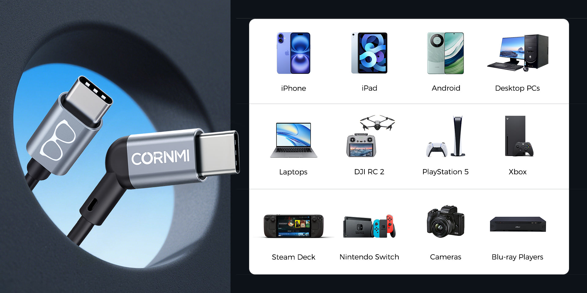The CORNMI NeoVista X7 connects to virtually any device with video output capabilities, including smartphones like iPhone 15/16 or Samsung Galaxy S24/S25 Ultra (via USB-C), gaming consoles like PS5, Xbox, or Nintendo Switch 2 (via HDMI or USB-C), and personal computers. Compatibility varies by experience. Always use CORNMI's official cables for wired connections.
